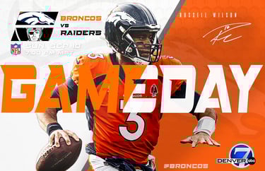 A co-branded NFL promotional video advertising Amazon and ABC's coverage of a 2025 Bronco's season game.